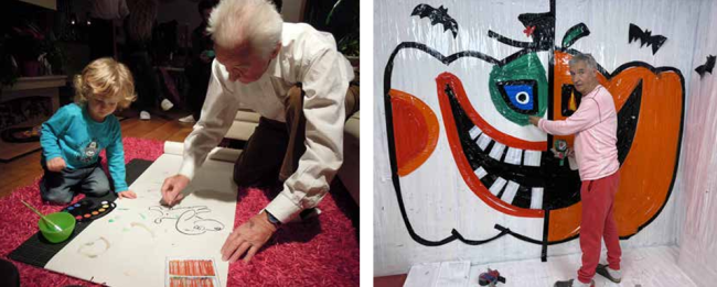 Michalův tatínek Miloš Nesvadba maloval, kudy chodil. Na snímku s vnoučkem o Vánocích v roce 2011 (vlevo), Michal a jeho nová láska – malování lepicí páskou (na obrázku Halloween) (vpravo)